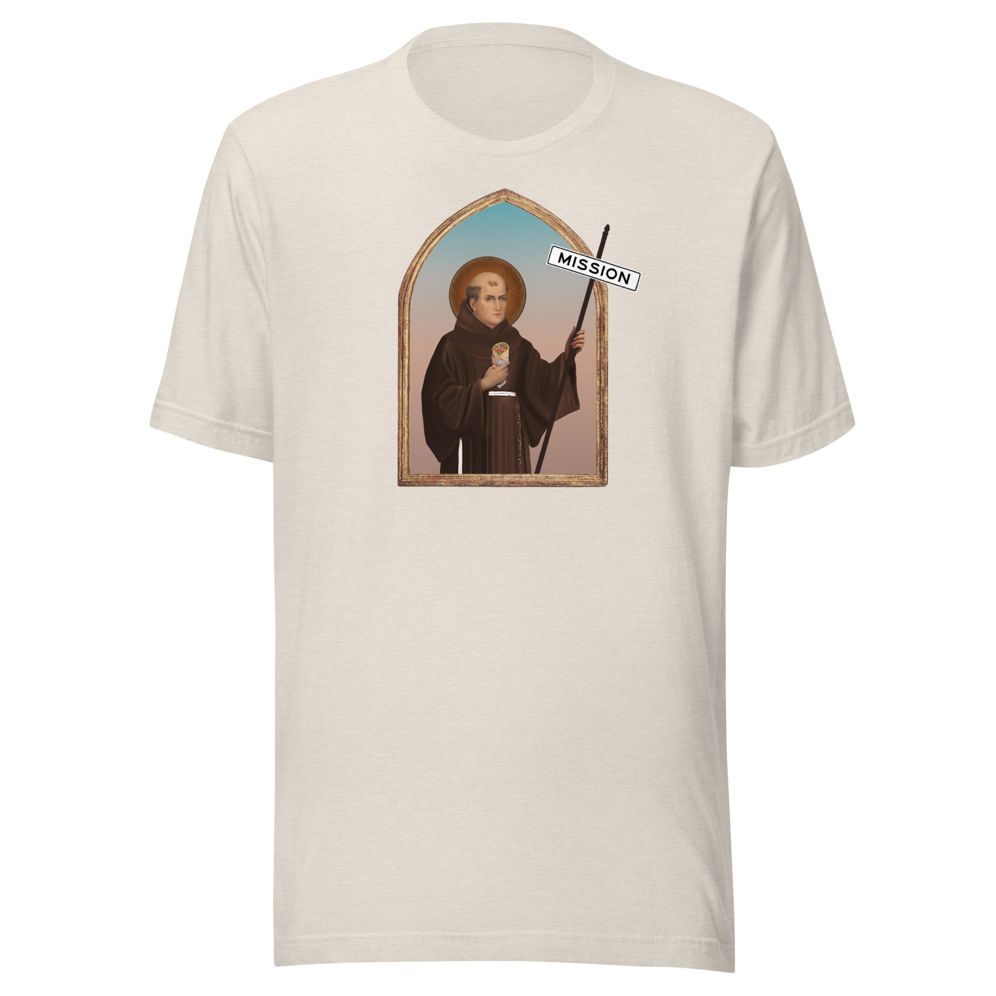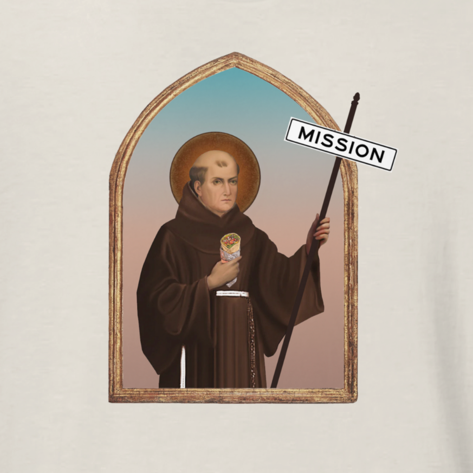 Lobster Tee is grateful for one of San Francisco's oldest and most vibrant neighborhoods, the Mission. Share the enthusiasm with this, our newest tee, depicting the moment when an early Catholic missionary discovered the best burritos in America.